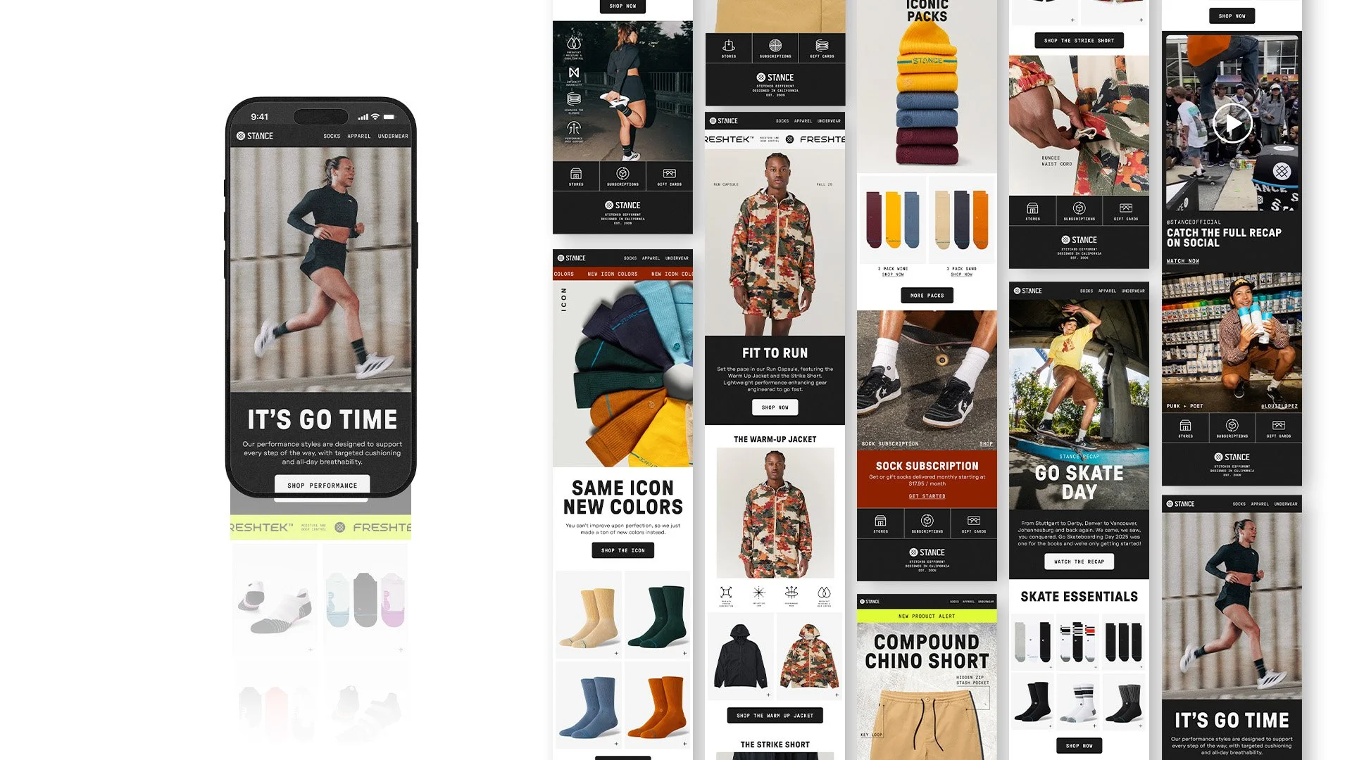 Working closely with Stance’s marketing team, I crafted digital marketing materials spanning email, homepage, and social. Each piece was designed to capture the brand’s energy and translate product narratives into compelling visuals.